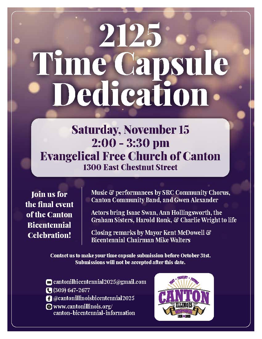 To learn more about the Canton Bicentennial, call 309-647-2677, email cantonilbicentennial2025@gmail.com, go to https://cantonillinois.org/canton-bicentennial-information/ , or the Canton Illinois Bicentennial 2025 Facebook page.