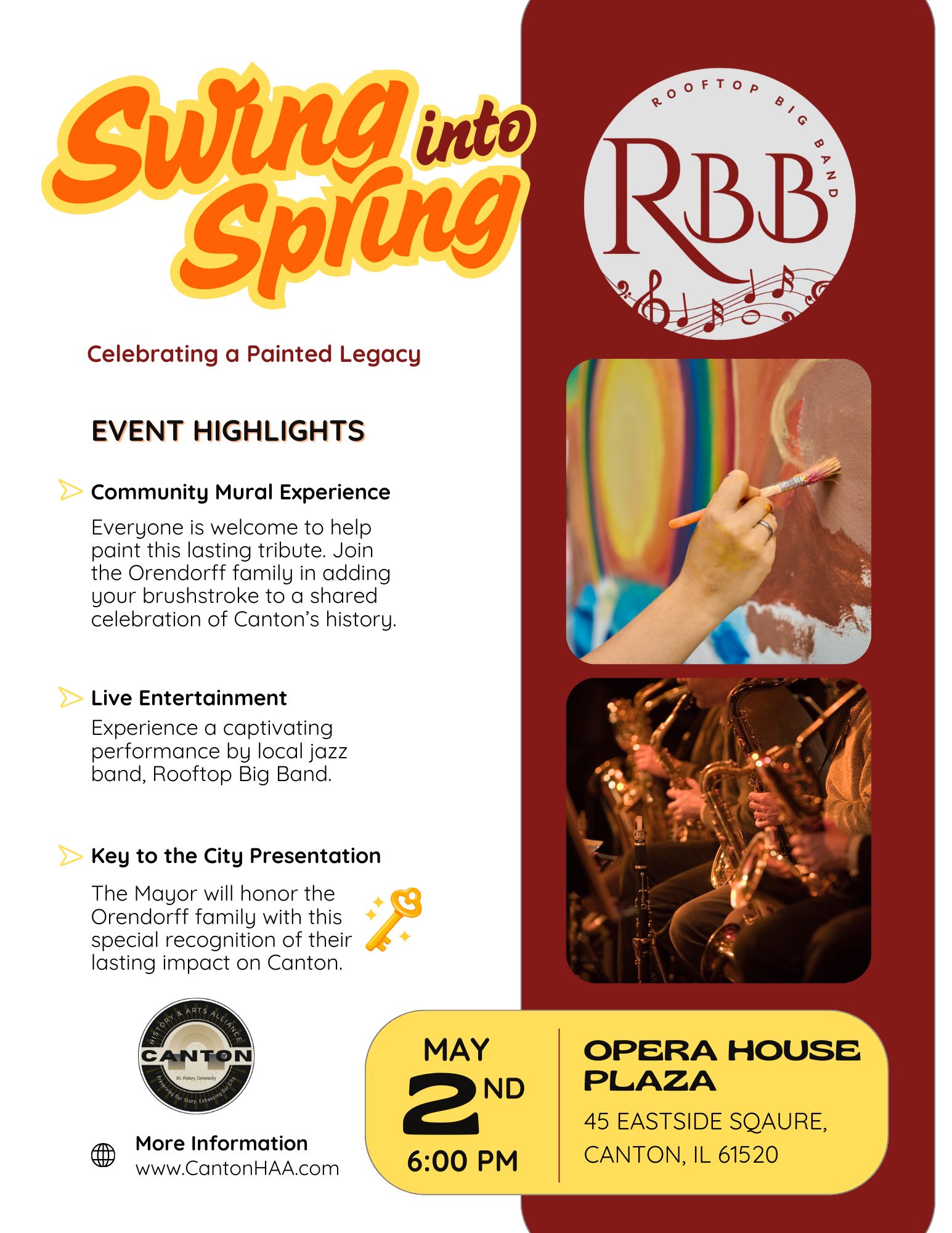The Canton History & Arts Alliance is a community-focused organization dedicated to enhancing Canton through arts, history, and beautification. Building on the momentum of the Bicentennial, the Alliance supports and activates the Opera House Plaza with events and programming, promotes and preserves the city’s historical sites and stories, encourages artistic expression through public art and performances, and leads efforts to beautify the community—strengthening pride and creating a vibrant, connected downtown.