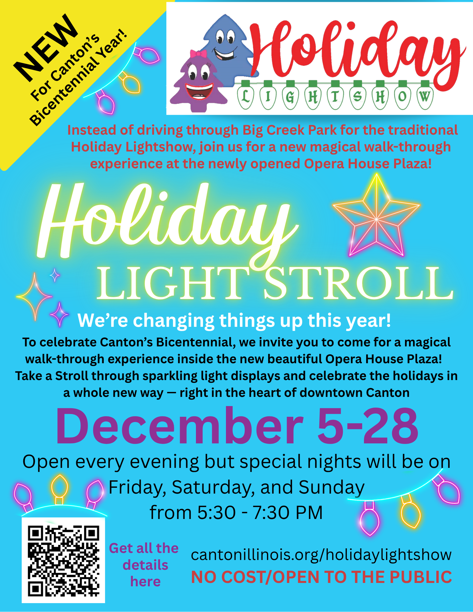 The Holiday Lightshow committee has decided to change it up this year! Instead of the drive through Holiday Lightshow in Big Creek Park…..we are planning to do a Holiday Light Stroll in the brand-new Opera House Plaza located in Downtown Canton.